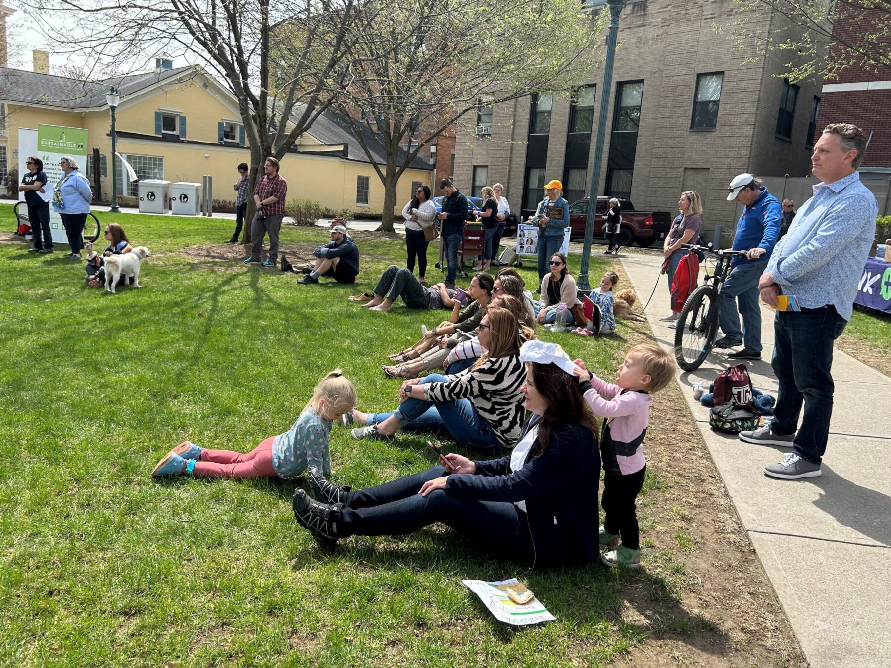 - Community members of all ages pause to listen to keynote climate speakers.